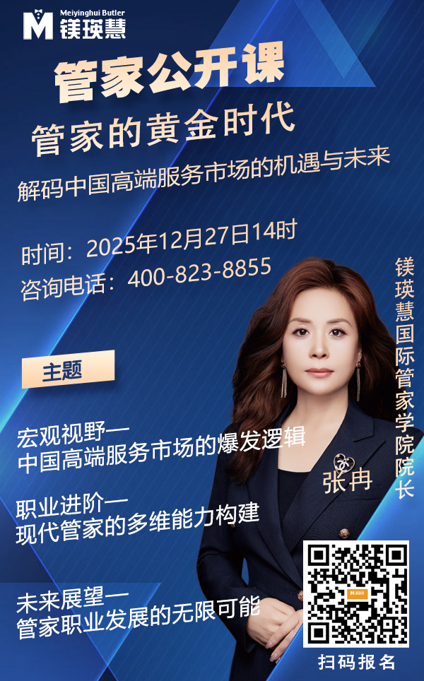 席位有限,洞察無(wú)限。 2025年12月27日下午2點(diǎn),讓我們相聚鎂瑛慧國(guó)際管家學(xué)院,共同繪制中國(guó)管家行業(yè)的未來(lái)藍(lán)圖,迎接屬于專業(yè)服務(wù)者的黃金時(shí)代。
