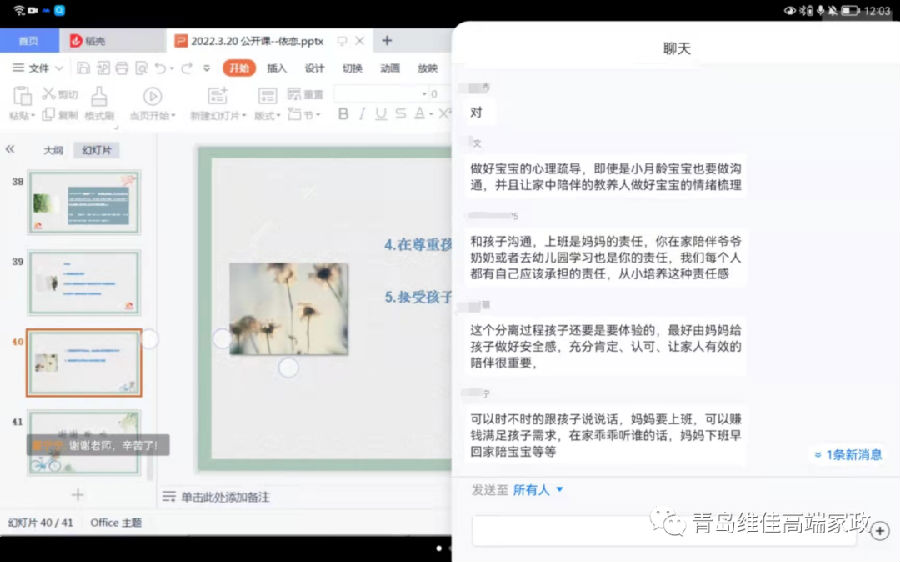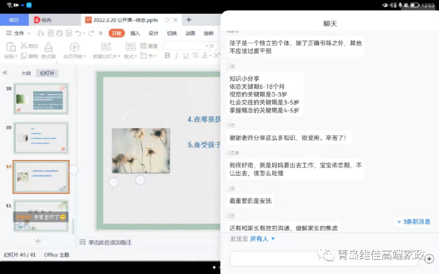 在課程最后我們就寶寶上幼兒園分離焦慮的現(xiàn)象以及小月齡寶寶與依戀對(duì)象分離的應(yīng)對(duì)措施做了分析,找出來(lái)一些解決辦法。大家都很棒,各抒己見(jiàn),很多想法和建議都很有建設(shè)性,更有專業(yè)的幼兒園園長(zhǎng)和幼兒教師給大家支招。